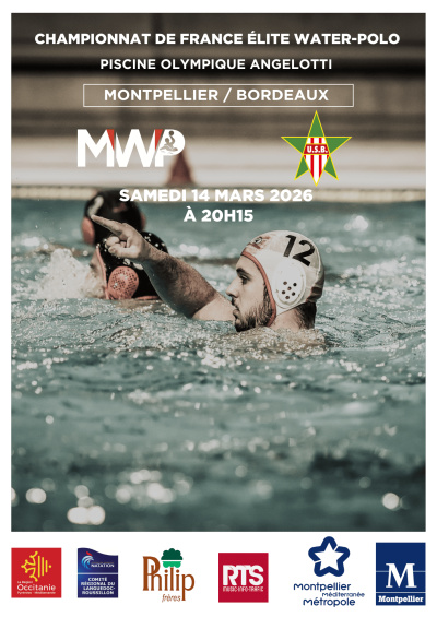 Message à destination des professionnels Après réservation veuillez nous contacter immédiatement au 04.67.42.26.98 afin d'obtenir vos places ! Sans appel de votre part vos places seront annulées. Le samedi 14 Mars à 20h15, le Montpellier Water-Polo vous donne rendez-vous à la piscine olympique Angelotti pour une rencontre décisive du Championnat de France face à Bordeaux. Un match important à domicile où chaque action comptera. Nos joueurs auront besoin de votre énergie et de votre soutien pour aller chercher la victoire ! Ambiance, intensité et spectacle seront au rendez-vous : venez encourager votre équipe et partager un grand moment de sport tous ensemble.