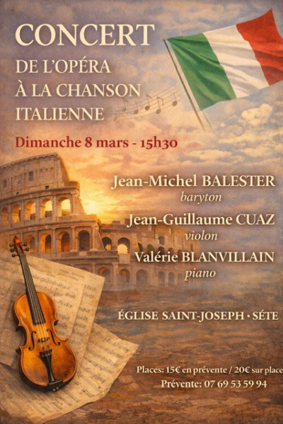 Laissez-vous emporter par un voyage musical au cœur de l’Italie ! Le dimanche 8 mars 2026 à 15h30, l’Église Saint-Joseph de Sète accueille un concert exceptionnel réunissant trois artistes talentueux autour d’un programme riche et varié : le baryton Jean-Michel Balester, le violoniste Jean-Guillaume Cuaz et la pianiste Valérie Blanvillain. Au menu de cette après-midi ensoleillée : des airs d’opéra passionné, des mélodies napolitaines chaleureuses, des musiques de films inoubliables et les plus belles grandes chansons italiennes. Un programme intense, romantique et solaire qui vous fera voyager sans quitter votre siège, porté par l’acoustique envoûtante de l’église. Le concert se tient à l’Église Saint-Joseph, située au 34 Rue Paul Valéry, 34200 Sète.