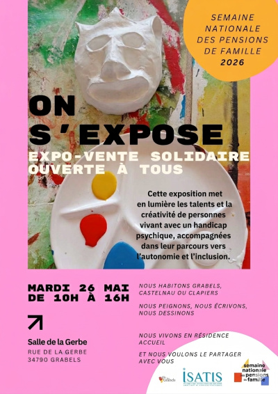 La 6ᵉ édition de la Semaine nationale des pensions de famille se tiendra du 25 au 31 mai 2026. Cet événement national a pour ambition de renforcer la visibilité des pensions de famille et des résidences accueil. Cette année encore, de très nombreux événements festifs et ouverts à tous seront organisés dans les pensions de famille. Vous trouverez ci joint le programme des évènements organisés sur Montpellier et dans les environs. https://www.pensionsdefamille.org/ Les résidences accueil de l’Hérault exposent leurs talents à Grabels et vous invitent à une expo-vente solidaire pour découvrir les œuvres réalisées par les résidents. Peintures, dessins, textes, photos… Cette exposition met en lumière la créativité et la sensibilité des personnes accompagnées. Au-delà du plaisir des yeux, cet événement est aussi une vente solidaire : vous aurez la possibilité d'acquérir des œuvres pour soutenir les projets artistiques des résidents. Les résidences accueil accompagnent des personnes vivant avec des troubles psychiques. À travers l’art, elles trouvent un moyen de partager leurs émotions et leur regard sur le monde. En ouvrant cette exposition à tous, les résidents souhaitent créer un moment de rencontre et de partage avec les habitants. Nous vous attendons nombreux pour ce rendez-vous solidaire !