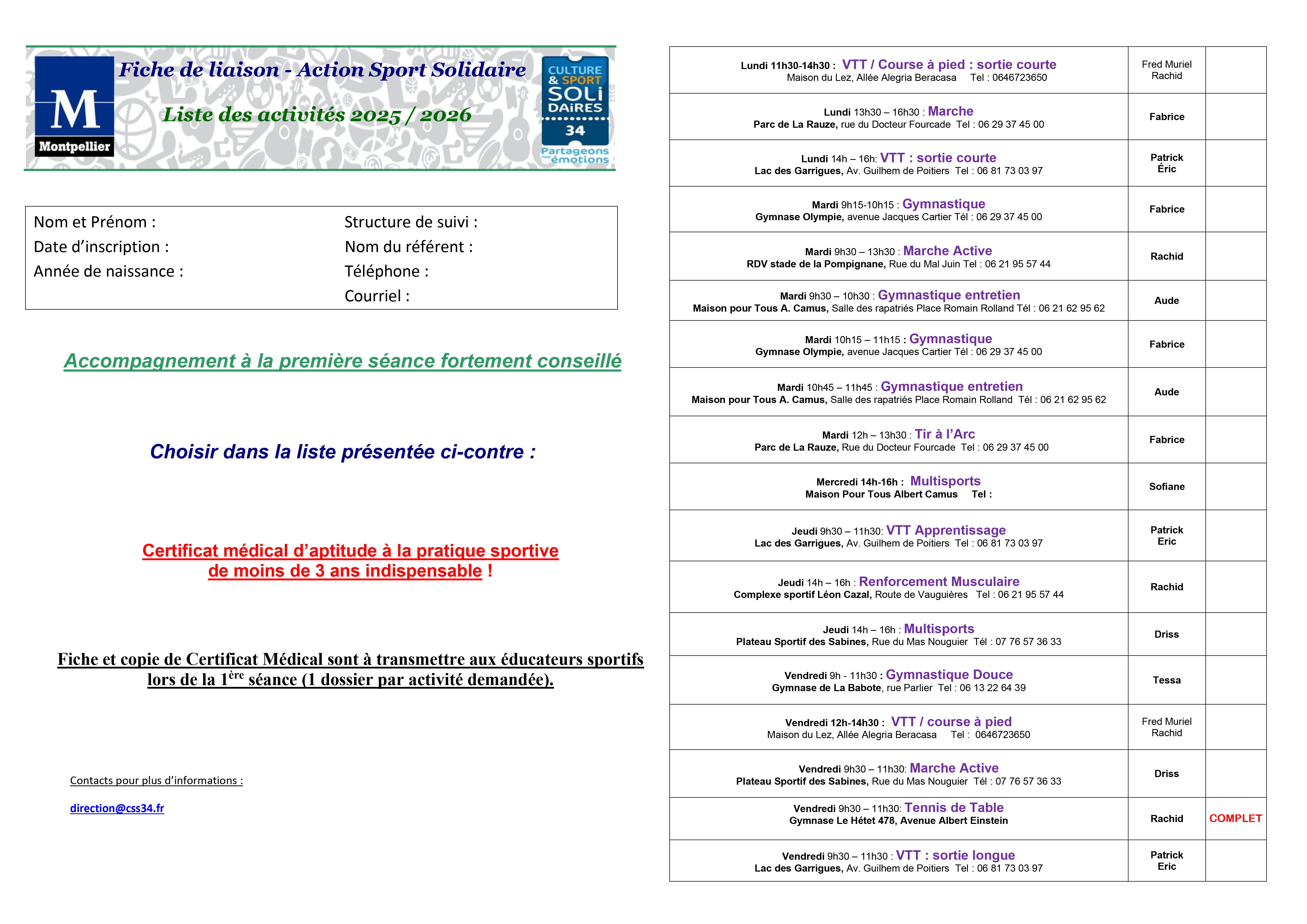 L'action Sport Solidaires co-créée entre la ville de Montpellier et CSS34, unique en France, permets aux publics majeurs suivis dans le cadre d'un parcours d'insertion de bénéficier d'un accompagnement sportif. Ces ateliers de pratiques sportives sont encadrés par des professionnels, agents du service des sports de Montpellier et ouvert tout au long de l'année (hors vacances scolaires). Téléchargez ici la fiche de liaison et le programme 2025/2026. Pour plus d'informations veuillez nous contacter au 04.67.42.26.98.